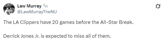 同样的对手,同样的伤病,同样至少休战6周,上一次琼斯因伤连续休战17场比赛,这一次又要至少伤停6周,快船记者Law Murray表示,预计琼斯将缺席20场比赛。